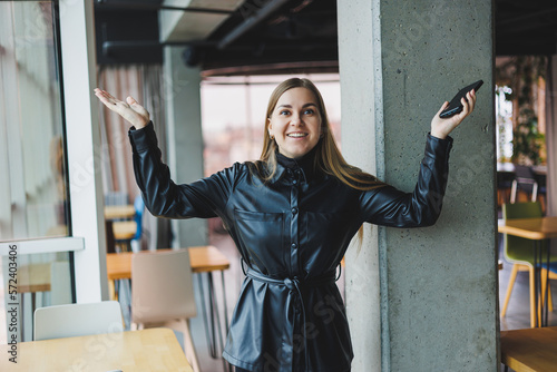 A smiling young woman is standing with a mobile phone in her hands and looking to the side while standing near a window reflecting sunlight. Modern workspace. Woman freelancer