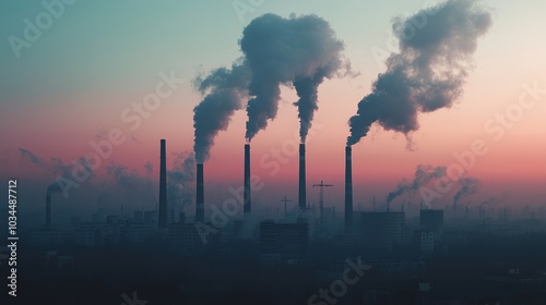 A smoky industrial skyline shows chimneys releasing pollutants into the atmosphere, highlighting environmental concerns.