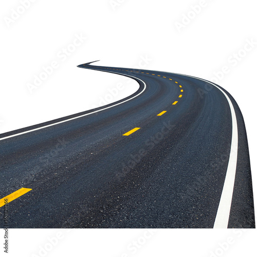 A smooth meandering road with dashed yellow lines, bordered by white edges and a contrasting black surface, evoking motion. Isolated on a transparent background