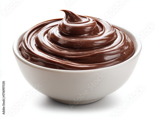 A smooth swirl of decadent chocolate pudding rests in a pristine white bowl. The rich, glossy texture of the chocolate is inviting and delicious