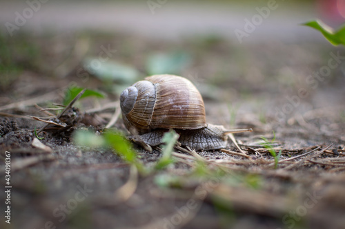 a snail crawls on the ground, sticking out its horns