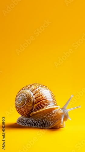 A snail glides gracefully across a vibrant yellow backdrop in soft light. A beautiful snail moves slowly over a bright yellow surface, showcasing its structure.