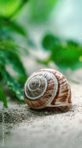 A Snail Shell with Green Leaves Backdrop Outdoors