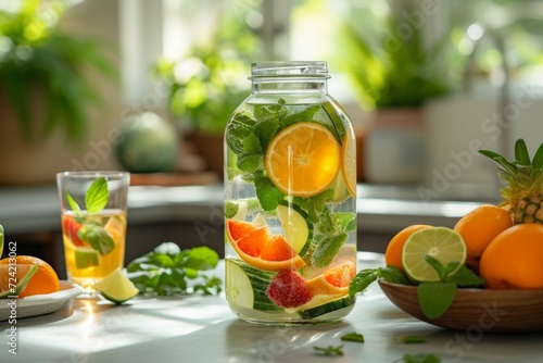 A snapshot of a table set with refreshing infused water, fresh fruits