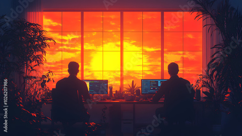 A Snapshot of Modern Work Life Featuring Men Engaged with Mobile Technology at a Cluttered Desk