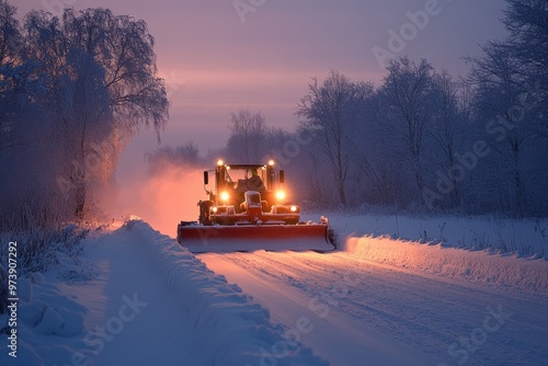 A snow plow clears a winter road in the early morning light, surrounded by a serene snowy landscape and soft hues of dawn.
