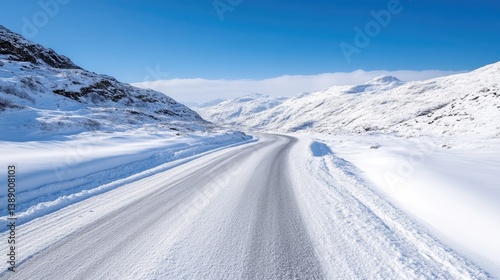 A snow-covered road winds through a mountainous landscape. High snow banks line the road. The scene is bright and sunny. The image is high-resolution, showcasing crisp detail. The style is realistic