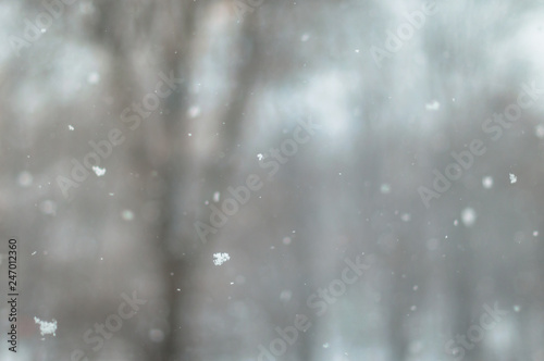 A snowfall in the park with big snowflakes