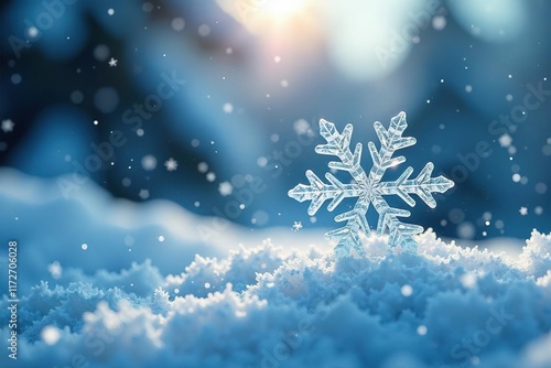 A snowflake crystal falls from the sky amidst falling snow, delicate, peaceful