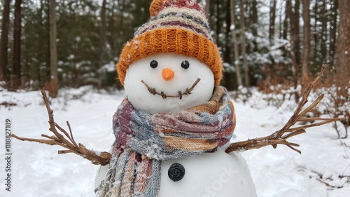 A Snowman with a Knit Hat, Scarf, and Twig Arms in a Snowy Forest