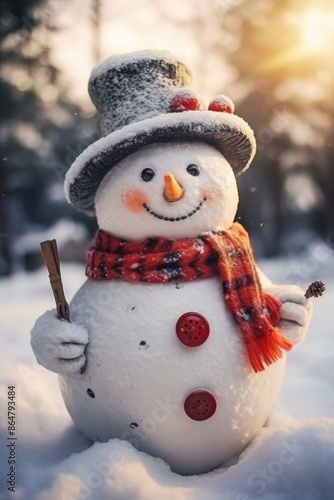 A snowman with a red scarf and a hat is smiling. The snowman is holding a stick in its right hand