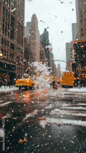A snowy city street with yellow taxis amidst falling snowflakes.