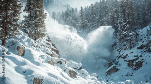 A snowy landscape features a dramatic avalanche cascading down, surrounded by tall evergreen trees under a clear blue sky.