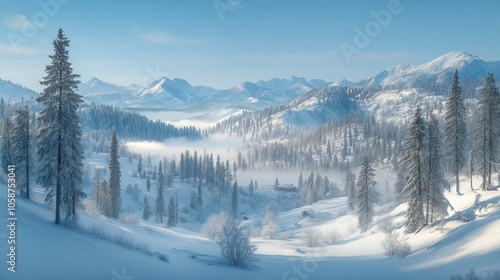 A snowy mountain valley with a foggy valley floor and snow-covered fir trees under a blue sky.