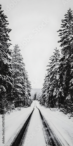 A snowy road in the woods with trees covered in dense white snow and a clear sky. Winter forest landscape. Concept of a winter walk in the forest.