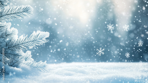 A snowy winter scene with soft blue hues and falling snowflakes