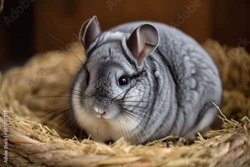 A snuggly and affectionate chinchilla cuddled up in a ball, resting or napping in its cage or playpen. Generative AI