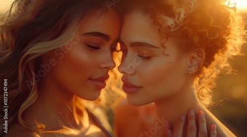 A soft and intimate moment between two women, sharing a close connection, illuminated by warm, golden light. Ideal for themes of love, intimacy, and emotional connection.