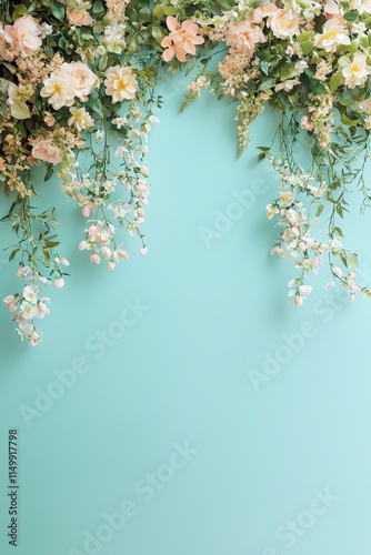 A soft floral wedding backdrop with cascading greenery and pastel tones.