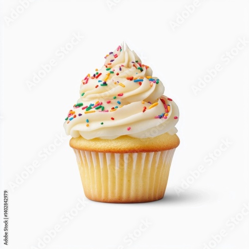 A soft fluffy cupcake topped with colorful sprinkles and a swirl of buttercream frosting, isolated white background, hyperrealism art style
