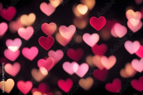 A soft focus bokeh effect of twinkling heart shapes in shades of red pink and gold on a black background, Ai Generated