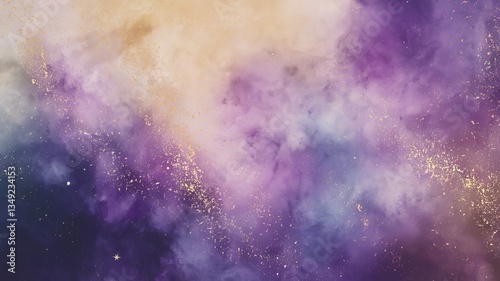 A soft, gradient of purples, blues, and golds blends with splattered metallic ink to form a mesmerizing cosmic landscape. Star-like speckles