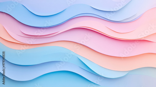 A soft pastel paper cut wave design with layered curves in peach, lavender, and sky blue, creating a calm, flowing background.