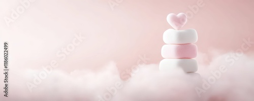A soft, pastel scene featuring stacked macarons with a heart on top, set against a dreamy, cloud-like background.