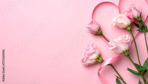 A soft pink backdrop features delicate flowers and a ribbon shaped into a heart, creating a lovely composition. The flowers have a light pink hue