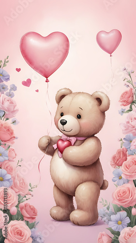 A soft, plush teddy bear holding a heart-shaped balloon, surrounded by pastel-colored flowers and a gentle pink background.
