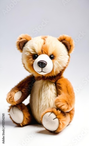 A soft, plush teddy bear with bright, welcoming eyes and a charming smile. AI generated.