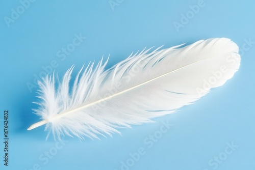 A soft white feather lays on a pastel blue background. It can be used for designs about dreams or softness.