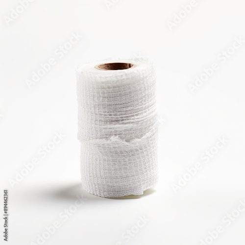 A soft white gauze bandage is isolated on a white background. The bandage is slightly wrinkled and has a few loose threads. It is a commonly used medical supply for treating minor injuries and wounds.