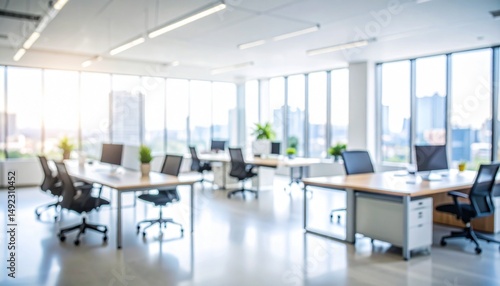 A softly blurred office interior with neutral tones and open-plan desks creates a clean, modern corporate atmosphere. Natural light streams through large windows.
