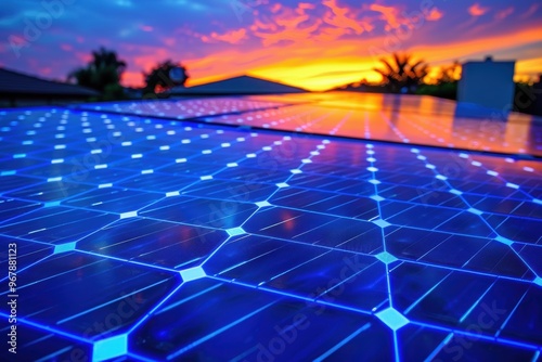 A solar panel with a blue background and a sunset in the background