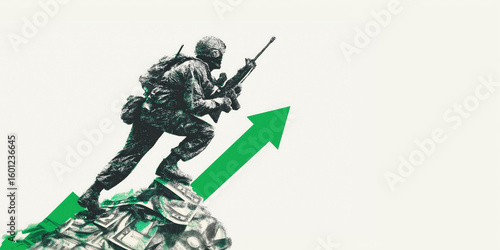 A soldier climbs a mountain of resources, symbolizing the intersection of military efforts and economic growth during wartime. This imagery captures the essence of war economy concepts