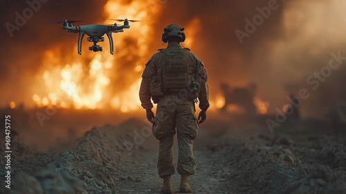 A soldier in camouflage stands in front of a fiery background with a drone hovering overhead.