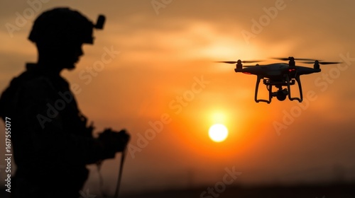 A soldier stands against a vibrant sunset, monitoring a drone's flight as it hovers nearby. The silhouetted figure focuses on a device, showcasing modern military technology in action.