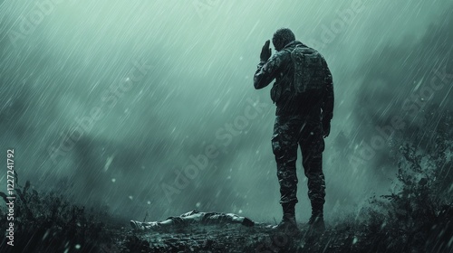 A soldier stands in pouring rain, his uniform completely soaked. With a strong posture and a salute, he pays tribute to a fallen comrade in a moment of deep reflection and honor