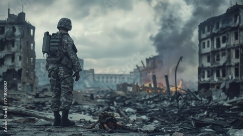 A soldier stands with his back to the camera and looks at the destroyed city
