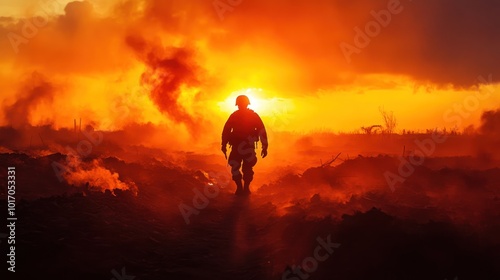 A soldier walks through a smoky landscape at sunset, evoking themes of conflict and resilience.