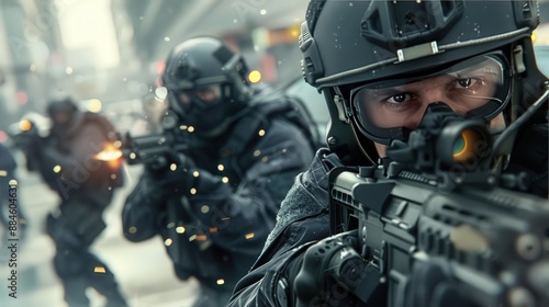 A soldiers are in a war zone. Scene is tense and serious, as the soldiers are in a dangerous situation