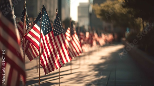 A solemn display of American flags honoring fallen heroes on Memorial Day a patriotic tribute softly focused against an