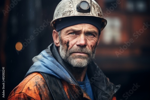 A Solemn Gaze Piercing Through the Industrial Haze: A Portrait of a Worker with the Weathered Walls of the Factory Behind