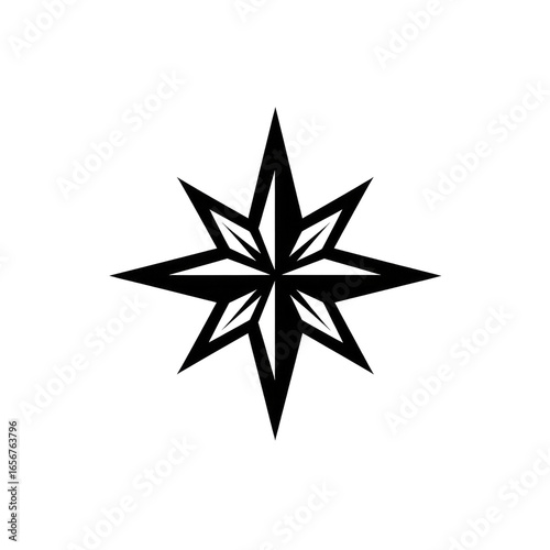A solid black, symmetrical star shape against a completely black background. Sharp, radiating lines create the star's points