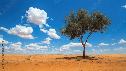 A solitary abstract tree of hope in the desert, its branches reaching toward the sky, standing in stark contrast to the arid, sandy surroundings