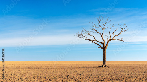 A solitary, barren tree stands against a clear blue sky, symbolizing resilience in a vast, arid landscape.