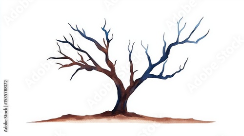 A solitary, barren tree with gnarled branches against a white background, symbolizing resilience and solitude.