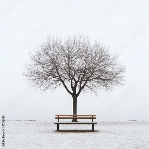 A solitary bench rests peacefully in the snow, surrounded by a tall tree, creating a tranquil winter scene.