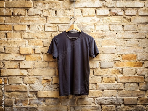A solitary black t-shirt hangs casually on a rusty metal hook against a distressed, creamy-colored brick wall, exuding a sense of relaxed simplicity.